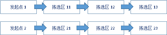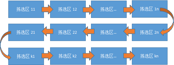 而對串行揀選來說,揀選是從一個統一的點發起的,依次完成所有揀選任務。示意圖如下: