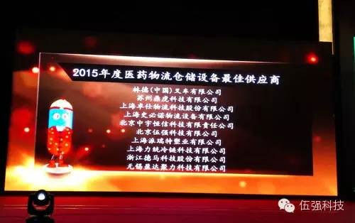 在晚宴上,由中國醫藥供應鏈聯盟舉辦的2015年度醫藥物流系列評選活動獲獎名單公布,伍強科技榮獲“2015年度醫藥物流倉儲設備最佳供應商”獎,伍強科技副總裁、市場部總經理、銷售總監渠曉通先生榮獲“2015醫藥物流年度風云人物”。