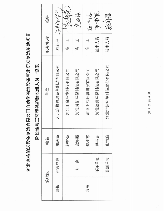 2018年5月21日,河北京格輸送設備制造有限公司組織召開了河北京格輸送設備制造有限公司自動化物流設備河北研發制造基地項目(階段性)竣工環境保護驗收會。參加會議的有建設單位、環評單位、監測單位的代表及專家共計6人,會議由以上成員組成驗收組,與會人員在考察現場的基礎上,聽取了河北京格輸送設備制造有限公司對環境保護設施“三同時”執行情況的匯報,監測單位介紹了驗收監測情況,經認真討論,形成驗收意見。