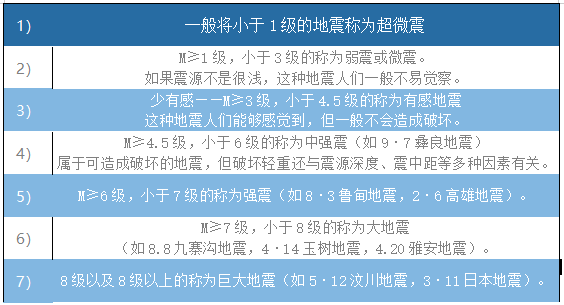 地震震級分為九級,一般小于2.5級的地震人無感覺,2.5級以上人有感覺,5級以上的地震會造成破壞。列表如下: