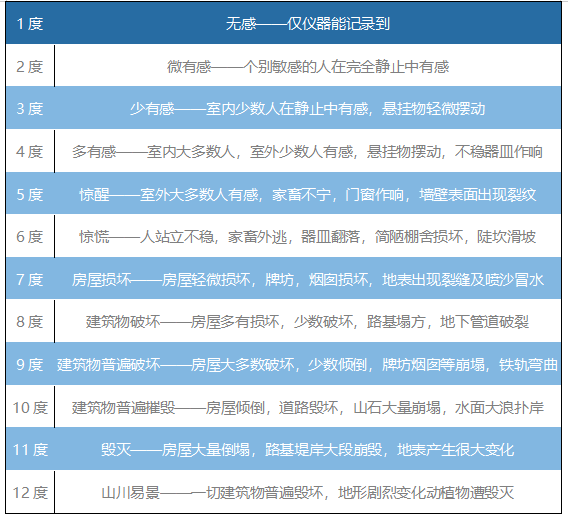 每個國家對于地震烈度的描述并不完全一樣,比如中國、美國、俄羅斯等均采用12級烈度,日本卻采用8級烈度,這是需要注意的。中國在1980年頒布了12級地震烈度表,如下所示: