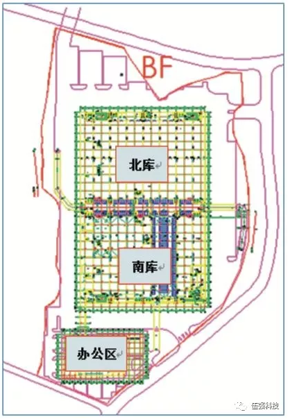 浙江聯(lián)華智慧物流紹興基地由南北兩座樓庫和辦公區(qū)組成。兩座樓庫均為4層建筑(包括地下1層、地上3層),中間隔有一條消防通道,每座樓庫單層建筑面積為2萬平方米。