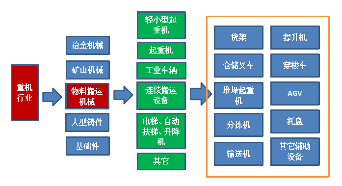 根據國標GB/T4754-2011《國民經濟行業分類》[1],我國物流倉儲與配送機械包含在物料搬運(起重運輸)機械大類下,再沒有詳細分類。如果要深究,物流倉儲與配送機械有很廣泛的內涵。見下圖: