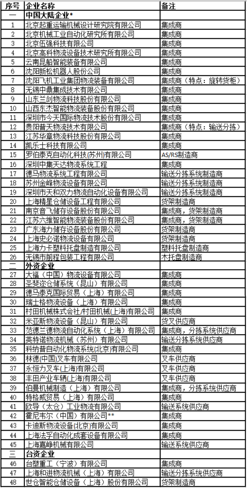 目前活躍在中國市場的物流裝備企業和系統集成商如下表: