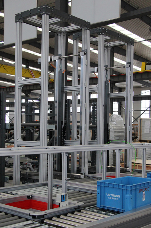 高速提升機可實現出入庫貨物在垂直方向的快速搬運。伍強智能科技展出的高速提升機起升速度可達3m/s,加速度達2m/s2。單貨位提升機額定載重為50kg,雙貨位提升機額定載重為100kg。