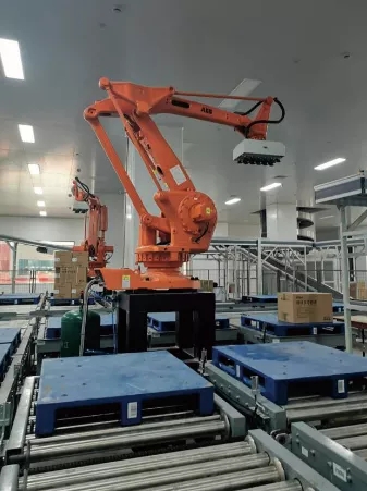 成品從生產(chǎn)線到立體庫的輸送采用箱式輸送系統(tǒng)完成,共3條輸送線(每層1條),并配置2臺機(jī)械手,自動碼垛入庫。可同時(shí)碼垛6個(gè)品種。