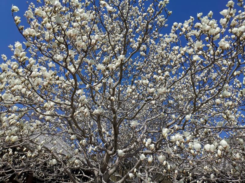 迎春花開后,緊接著就是玉蘭花。北京人特別喜歡玉蘭花,不僅每個公園會種,差不多每個學校都會種上幾株。我想,它開得早是一個原因吧,但更主要的原因還是因為好看。玉蘭花的顏色多種多樣,有純白色的、粉色的、紫色的、黃色的和雜色的等等,玉蘭花顏色并非特別的艷麗,卻蘊含有一種高貴、典雅、端莊的氣質,尤其是質地很美,有著和田子玉的暖潤和精美瓷器的質地。玉蘭花花期較短,大概只有十多天的樣子。記得有一年的春天,我要到南方出差,走的時候看到玉蘭花含苞待放,等過了兩周回來時,花已經開始凋謝。