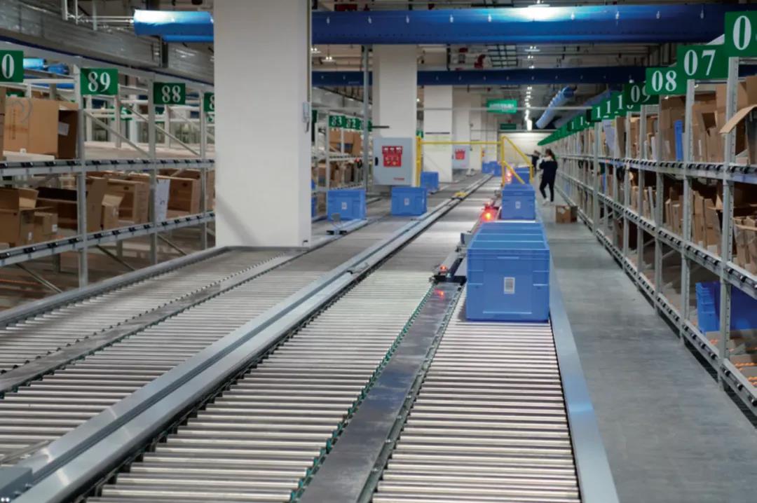 打包復核作業區負責所有揀選周轉箱的打包復核。復核后的箱子(紙箱或周轉箱)通過輸送機進入一樓分揀機分揀。