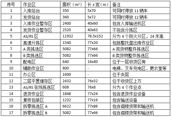 物流中心一層設置了入庫區、自動化立體庫、A類揀選區、B類揀選區、自動分揀區、發貨區,二層為平置作業區、在線揀選區、拆零作業區、拆零復核區、退貨處理區,詳見表1。