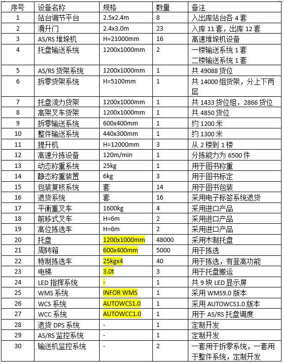 自動化立體庫使用了16臺堆垛機,共有49088個貨位。物流中心內部同時使用了托盤輸送系統、整件輸送系統、拆零輸送系統、提升機、高速分揀設備、動態稱重系統、靜態稱重裝置、托盤流力貨架、高架叉車貨架、特制揀選車等相關設備,并且設置了包裝復核系統、退貨系統,詳見表2。