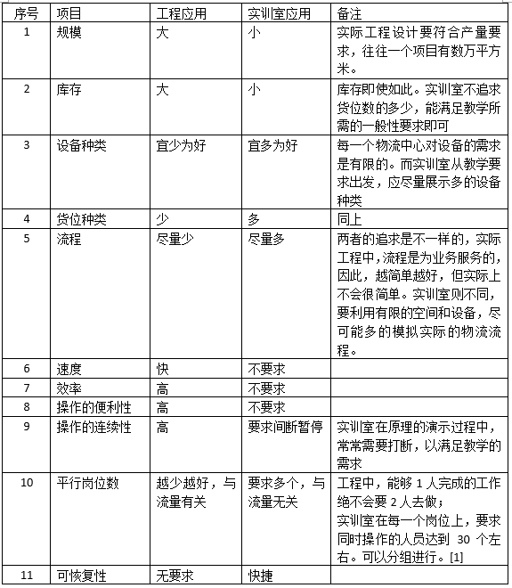 此外,要理解實訓室與企業具體應用存在一個顯著的差別是:對一個實際應用案例來說,流程越簡單越好,速度越快越好,效率越高越好。而實訓室建設,并不追求規模、速度與效率,而是要在簡單的實訓室中,要在一個相對比較簡單的環境中,模擬出現實中復雜的物流過程和應用。表一列出了一些主要差異。
