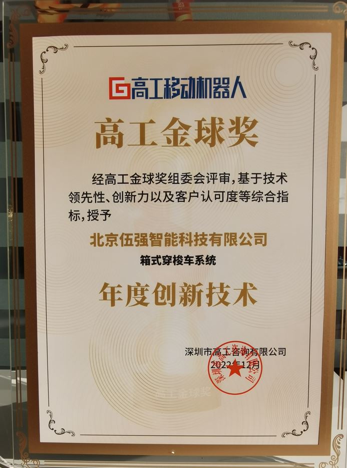 在頒獎晚宴現場,大會公布了高工金球獎獲獎企業名單,伍強智能科技憑借箱式穿梭車系統,榮獲2022高工金球獎——年度創新技術。