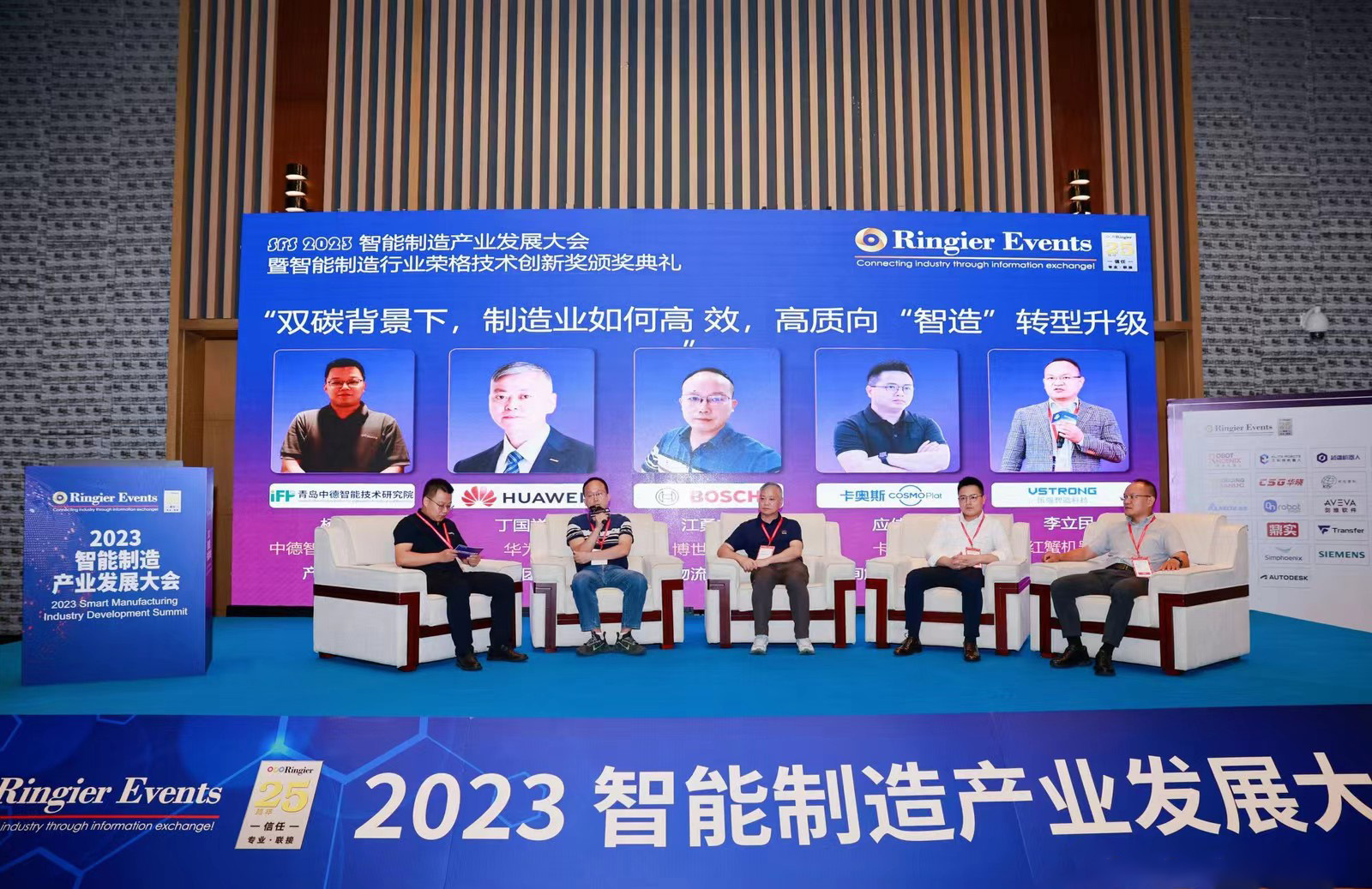在圓桌會議環(huán)節(jié),中德智能技術(shù)研究院產(chǎn)研部部長楊志浩與華為制造軍團(tuán)首席專家丁國祥、博世華域物流經(jīng)理江勇前、卡奧斯咨詢解決方案總監(jiān)應(yīng)佳明、紅蟹機(jī)器人(蘇州)有限公司副總經(jīng)理李立民圍繞“雙碳背景下,制造業(yè)如何高效,高質(zhì)向智造轉(zhuǎn)型升級”的話題進(jìn)行深入交流。